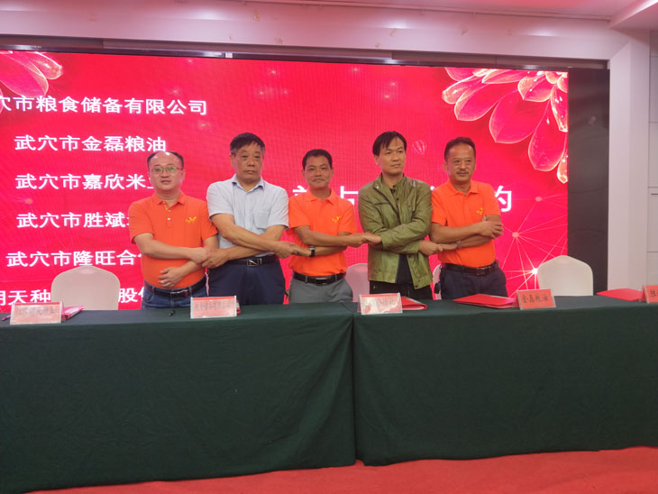 會議最后舉行了“富美占”戰略簽約儀式,武穴市糧食儲備有限公司、武穴市隆旺合作社、江蘇明天種業科技股份有限公司以及多家米企負責人上臺共同簽署了“富美占”戰略合作協議。